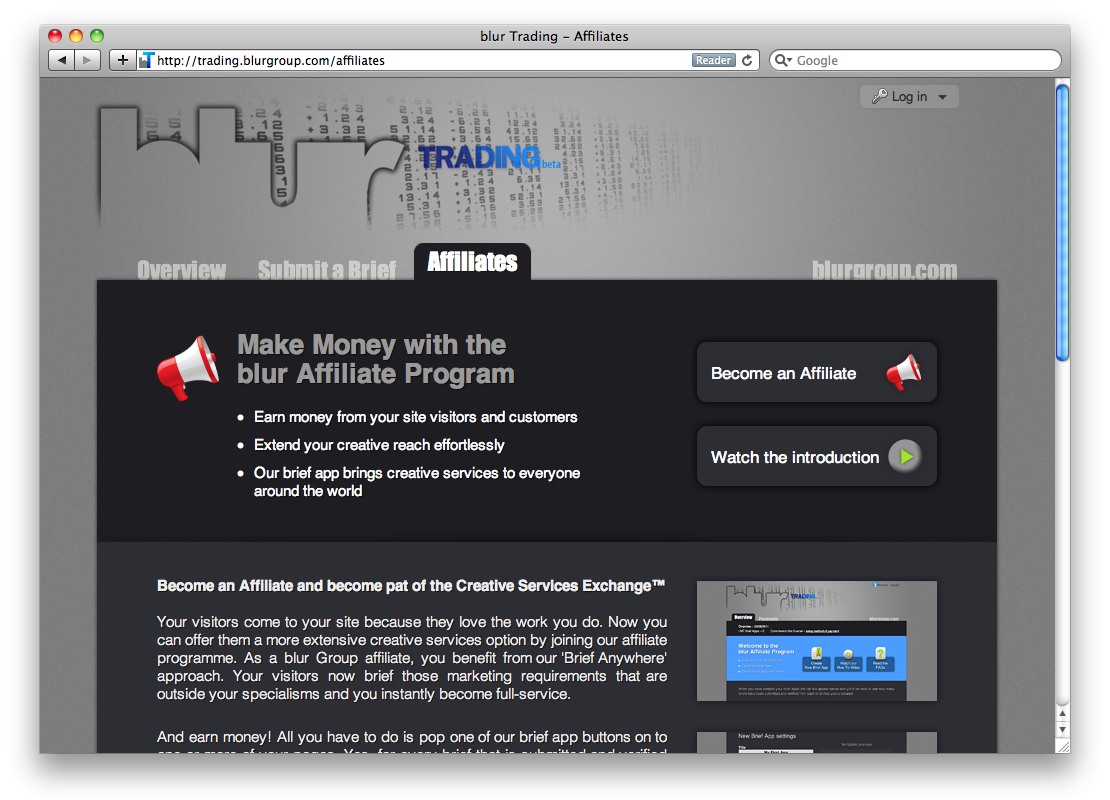 Like similar services offered by Amazon and other online retailers the Creative Services Exchange Affiliate programme allows website owners to earn revenue by connecting their users to the blur Group service.