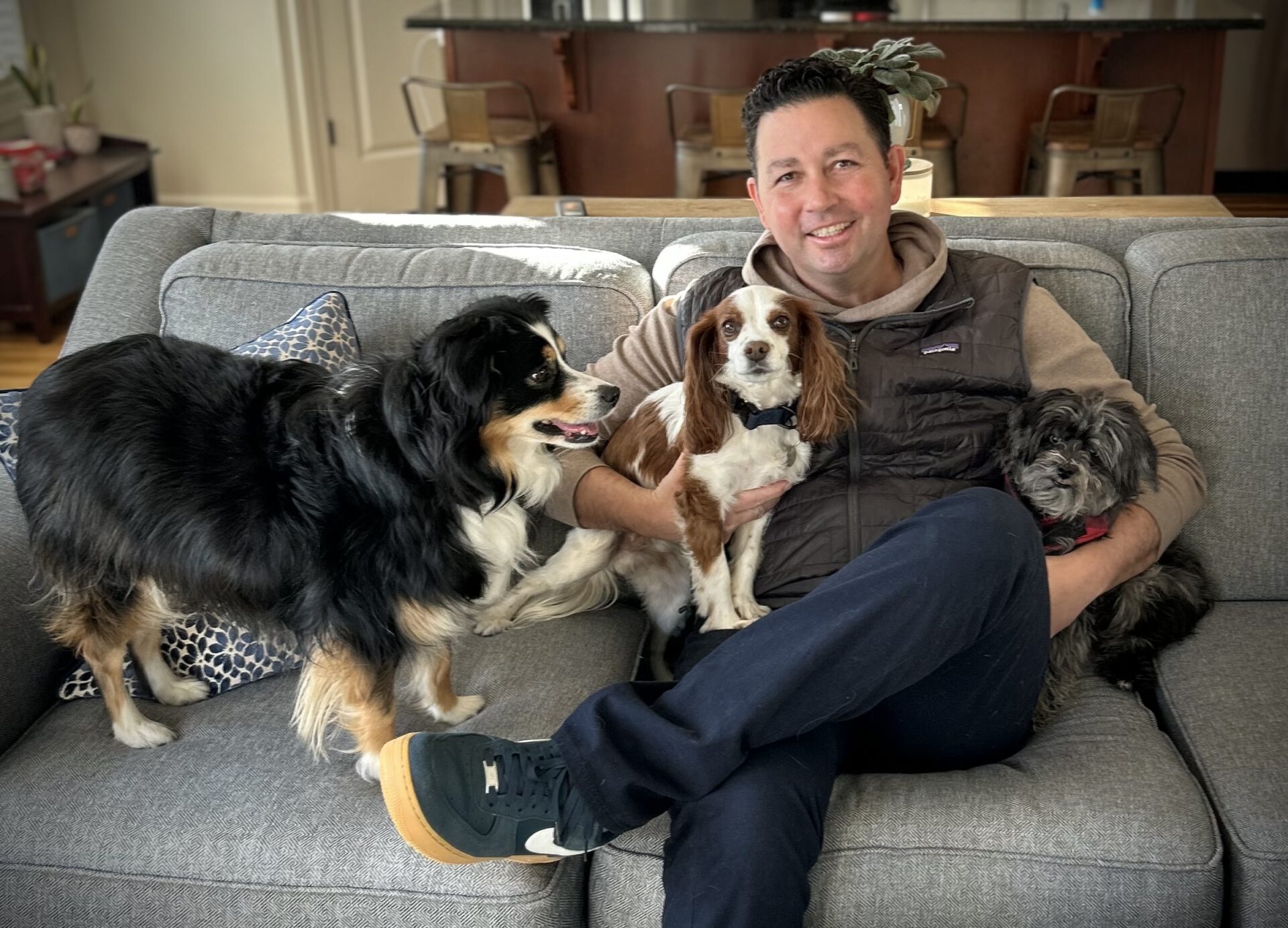 BestyBnB Co-Founder Matt Krentz with his dog Lucky and two BestyBnB Foster Dogs, Bailey and KC