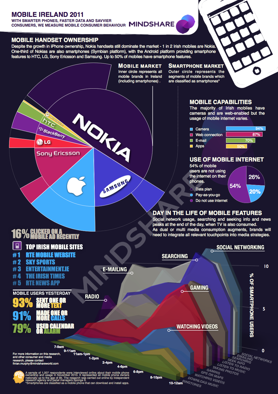 Mindshare Ireland (@MindshareIRL) have published an interesting infographic regarding smartphone usage in Ireland. The survey, conducted by Sponge It in November 2010, suggests that while over half of Irish consumers own a smartphone, many don’t use their device to its full potential.
