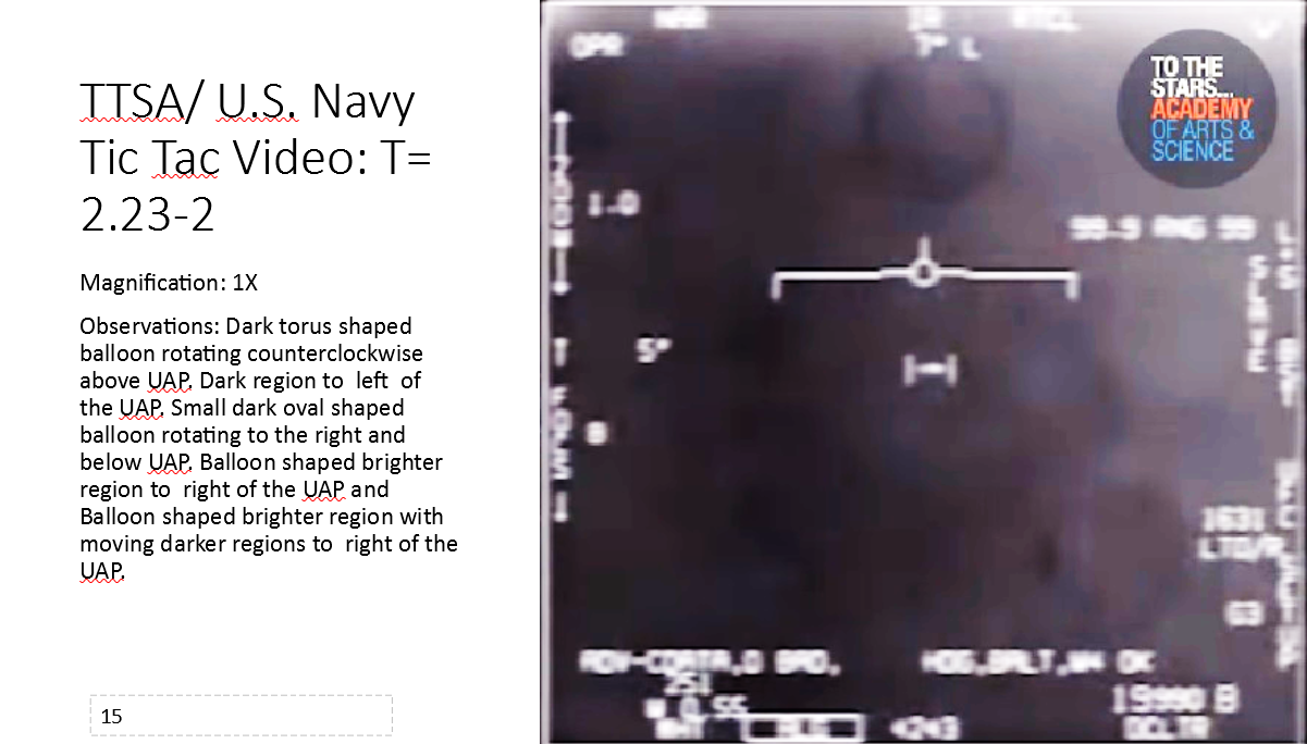 A balloon shaped brighter region to right of the UAP appearing warmer on IR was observed. Also observed was a balloon shaped brighter region with moving darker regions to right of and under the UAP directly to the right of the small dark oval shaped balloon. See slides 14 –17, 28 — 29, and 31 – 35 [below].